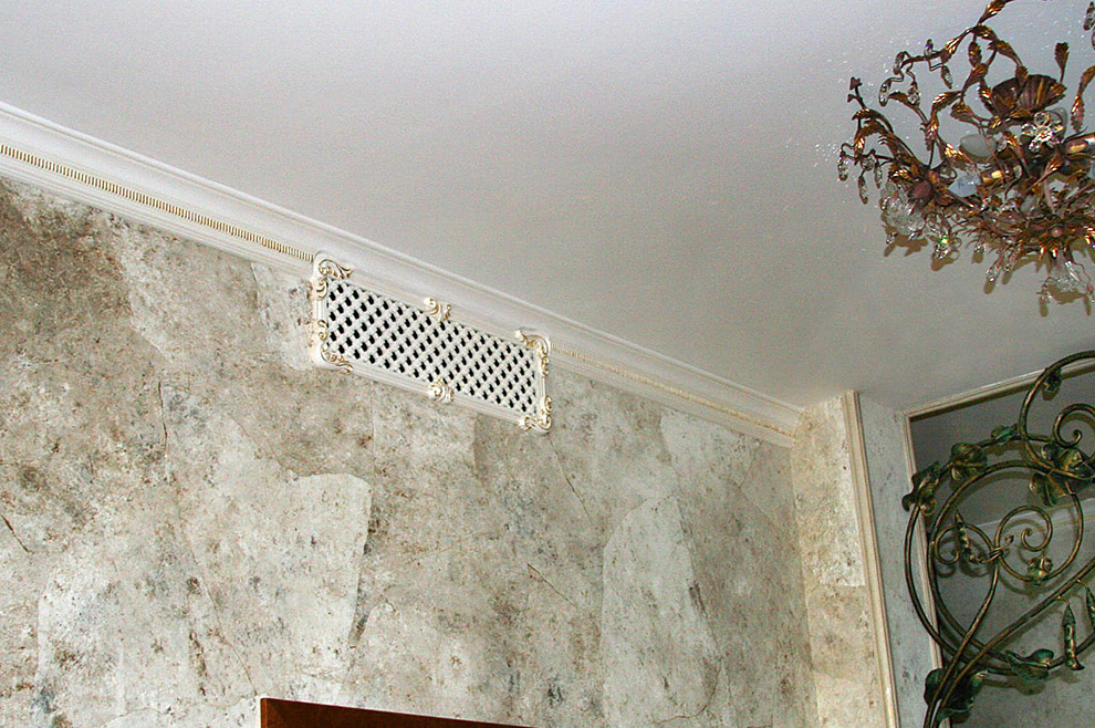 Многое зависит от конструктивных особенностей системы вентиляции: в помещениях с принудительной вентиляцией решетки подачи холодного воздуха часто расположены в нижней зоне, а удаление теплого - в верхней. В этом случае нижние решетки вписывают в рисунок цокольной части стены - панели, верхние - в фриз, опоясывающий комнату. При отсутствии фриза или при необходимости выноса вентрешетки под потолок, ее можно вмонтировать в вогнутую часть карниза.